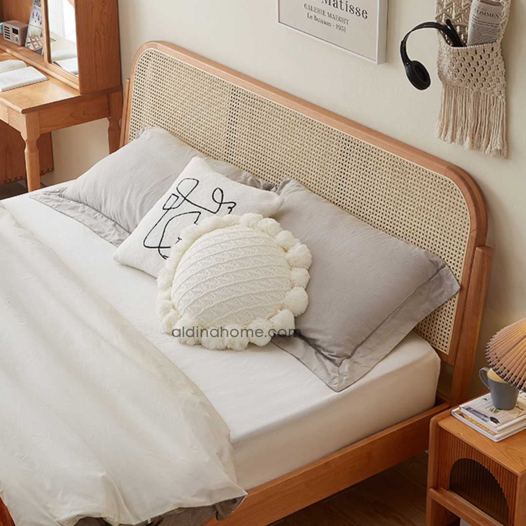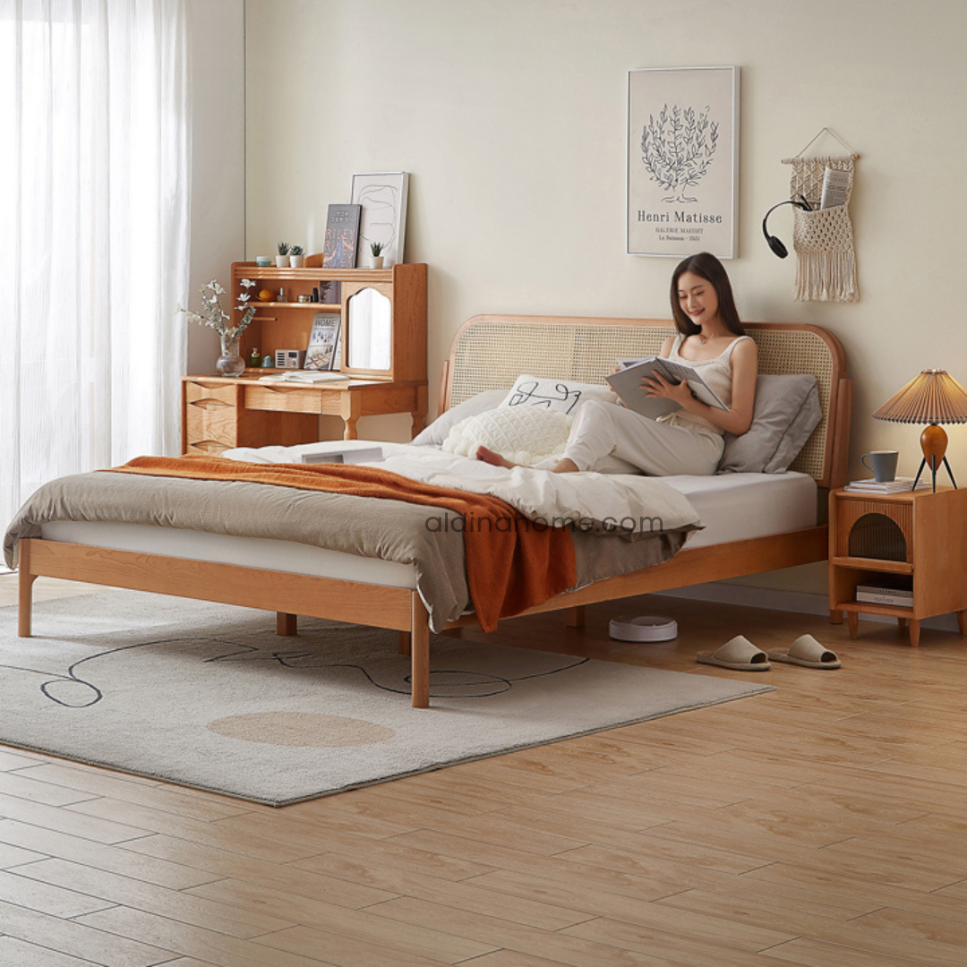 Desain klasik bernuansa vintage dengan sentuhan minimalis. Rangka kayu jati solid yang kokoh dipadukan dengan sandaran kepala rotan anyam melengkung—ringan, lapang, dan kontras elegan dengan garis bingkai yang tegas. Tersedia dua pilihan finishing: Natural yang menonjolkan serat kayu, dan Hitam berlapis cat premium. Bilah (slat) rapat dan kuat menjaga kasur tetap stabil.